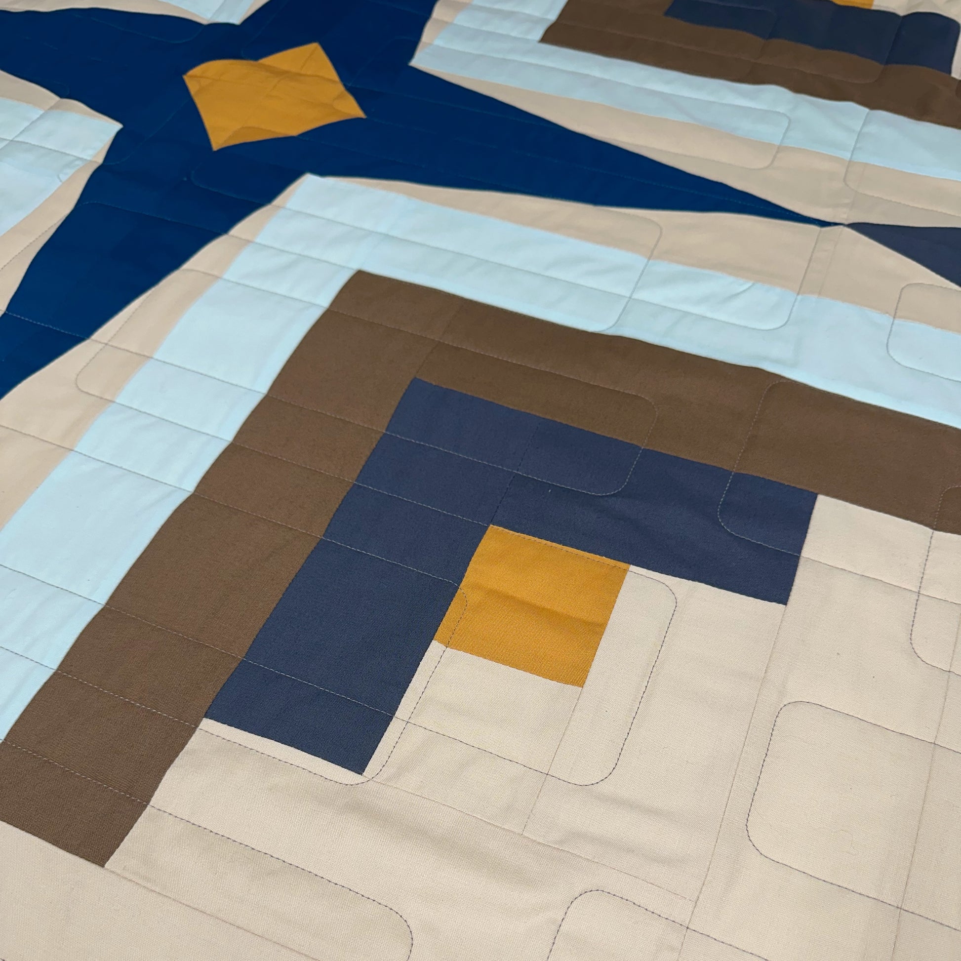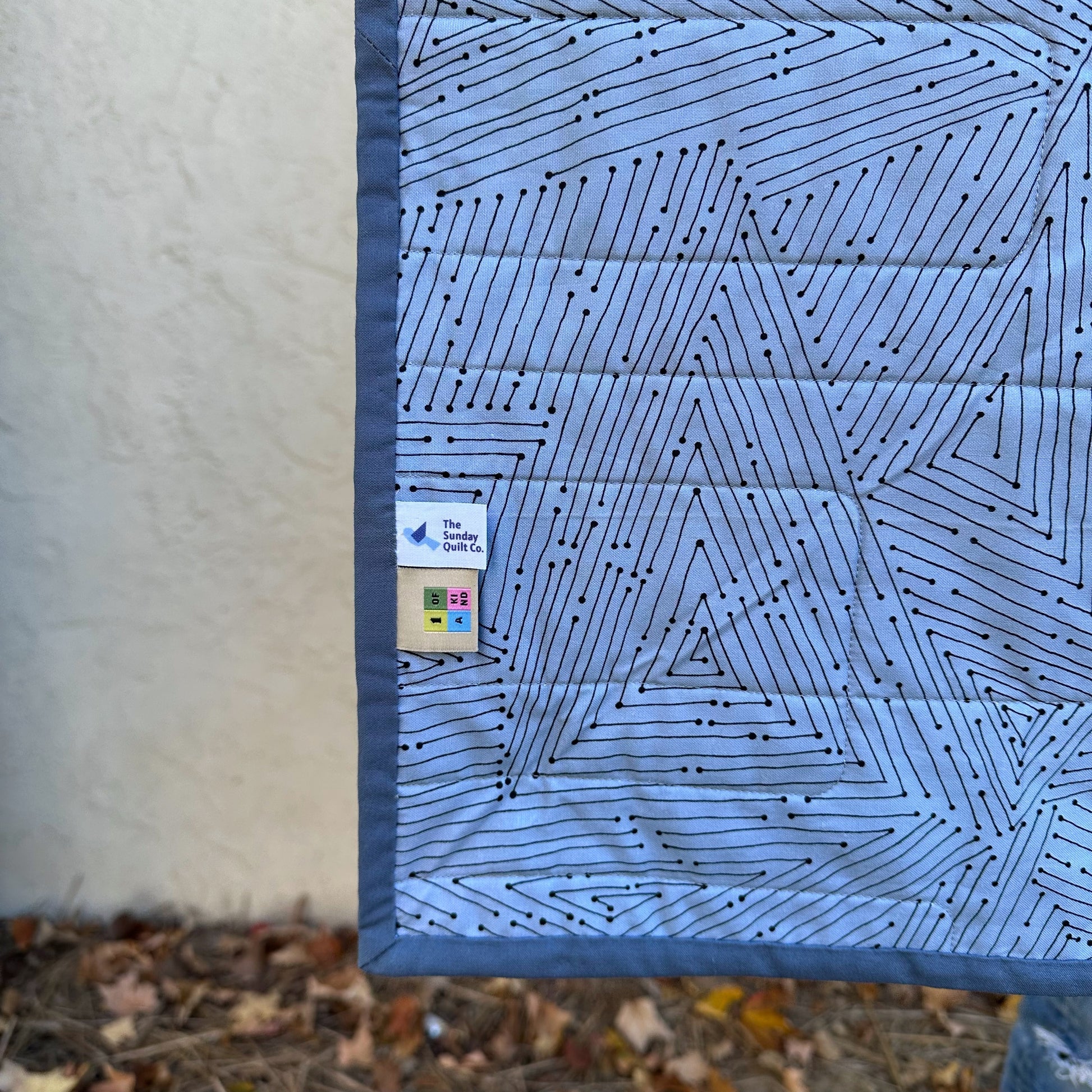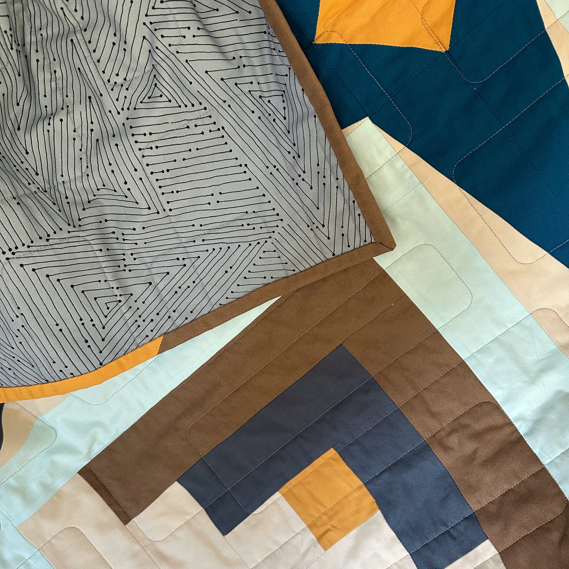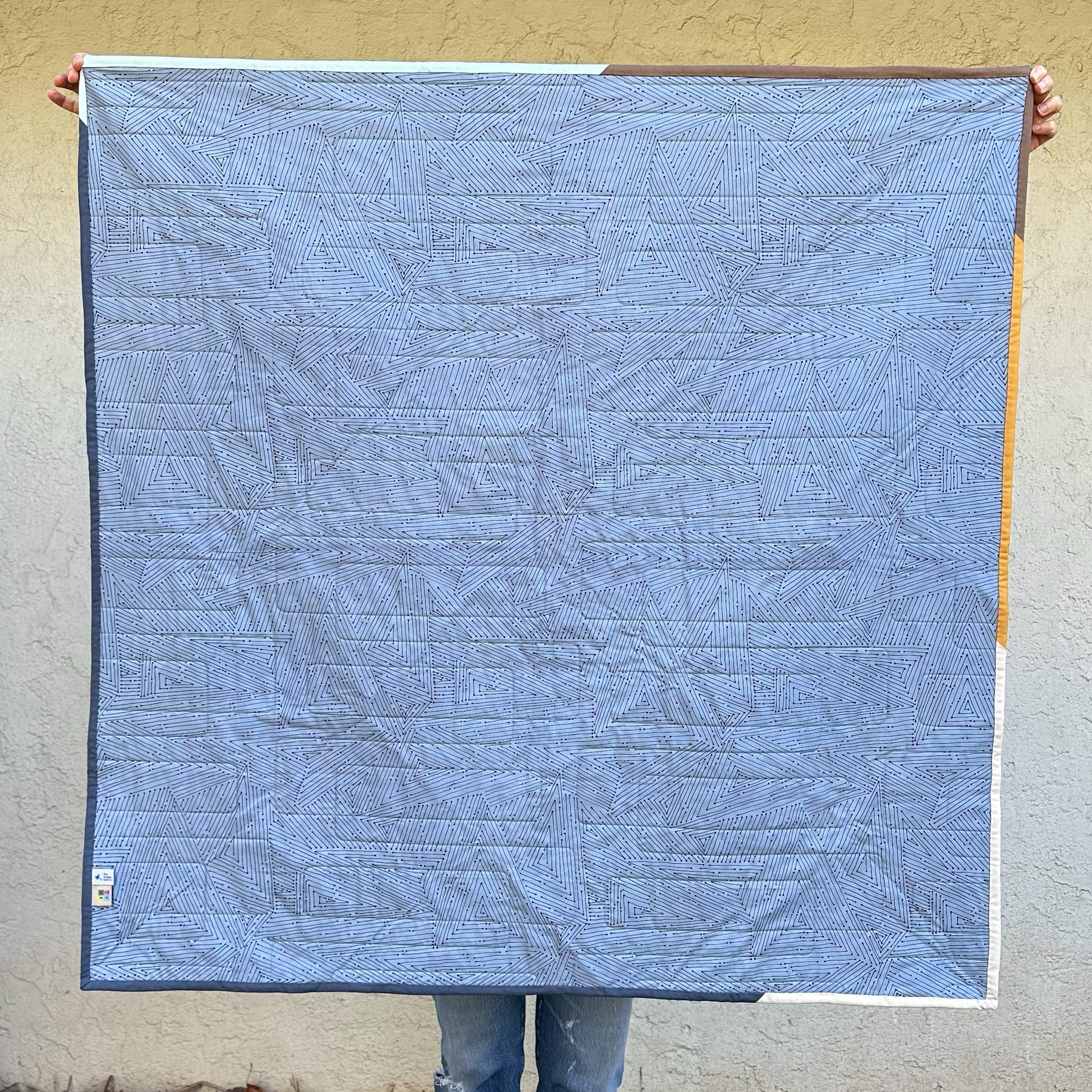 This small-sized quilt is full of movement and charm, featuring a striking design of interlocking triangles that create a modern geometric flow. The palette — mustard, cream, blue-gray, and cobalt — strikes the perfect balance of warmth and calm, evoking golden sunlight against soft, cool skies.