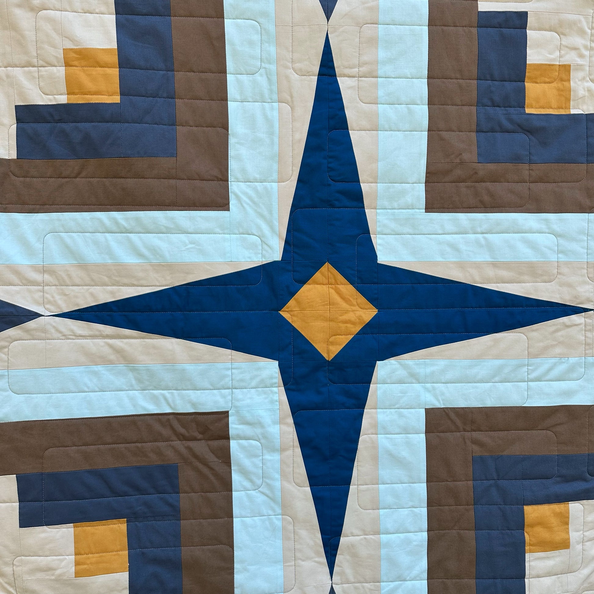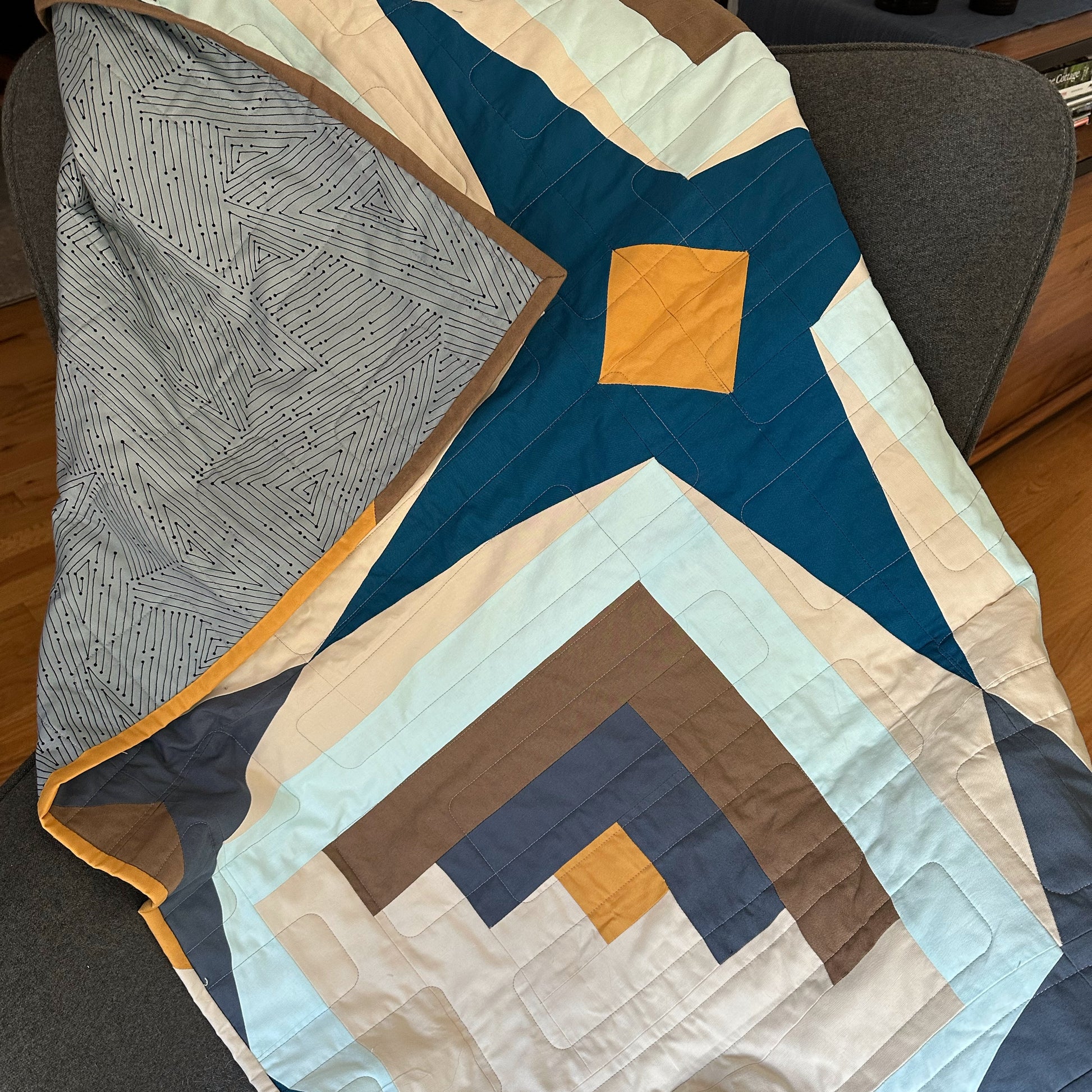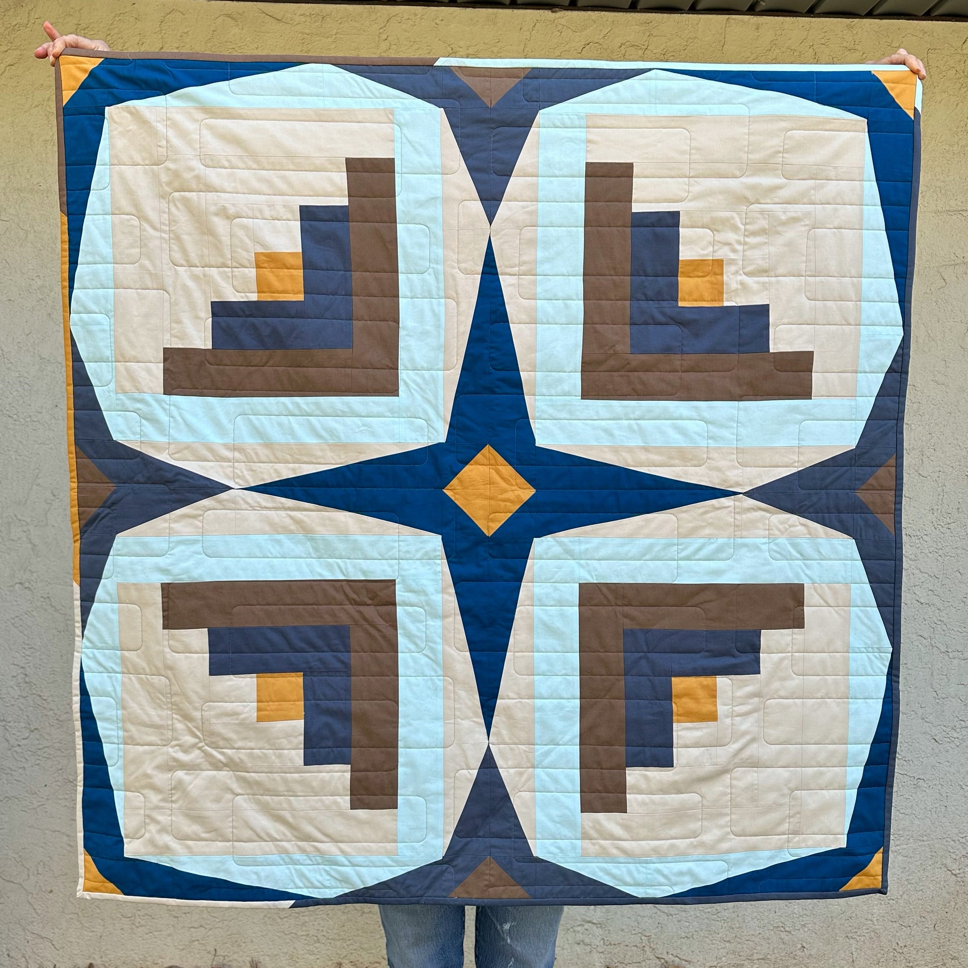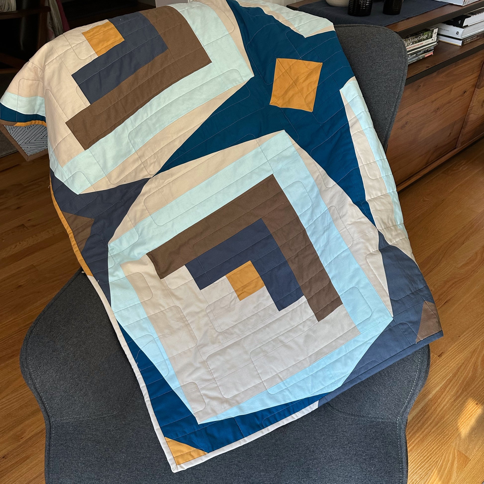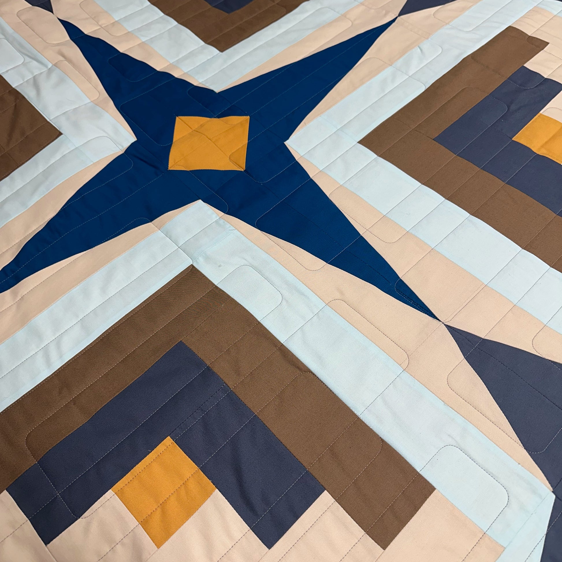 This small-sized quilt is full of movement and charm, featuring a striking design of interlocking triangles that create a modern geometric flow. The palette — mustard, cream, blue-gray, and cobalt — strikes the perfect balance of warmth and calm, evoking golden sunlight against soft, cool skies.